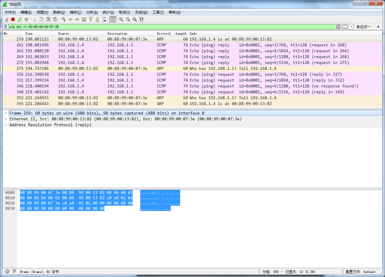 eth.src == 00-88-99-00-07-3E and eth.dst == FF-FF-FF-FF-FF-FF。