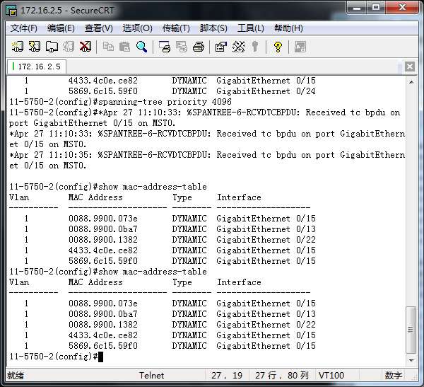 显示两台交换机的MAC地址表, 通过ping让每个MAC地址表包含全部主机的MAC地址,然后截屏:
