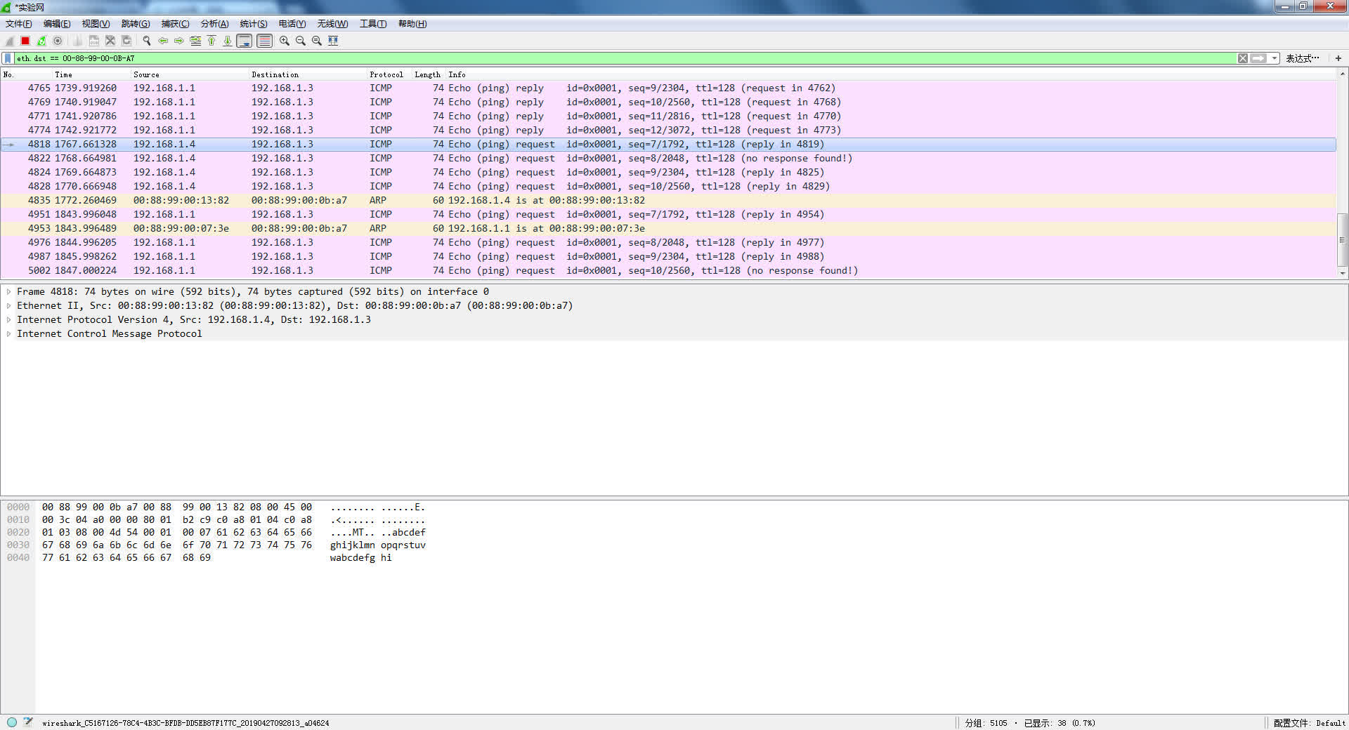 每台主机用Wireshark检测出一个其它主机发给自己的以太网帧并截屏(用anysend或者用ping IP地址产生包)。Wireshark Filter:eth.dst == 84-A6-C8-C0-BB-CF(主机的实验网网卡地址)进行过滤。