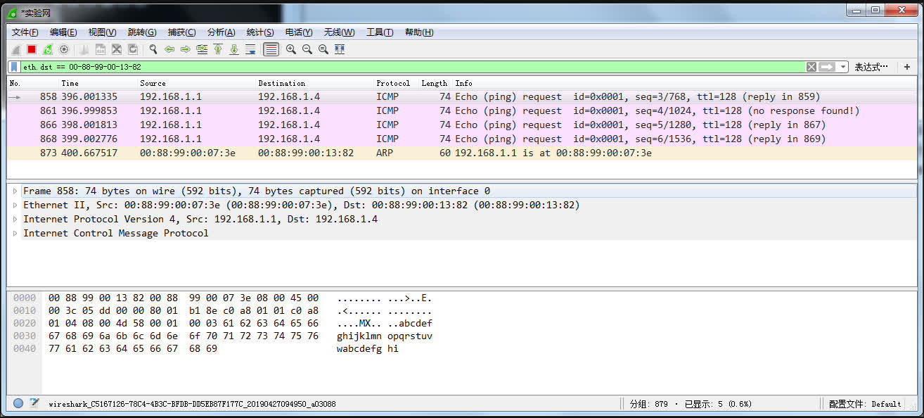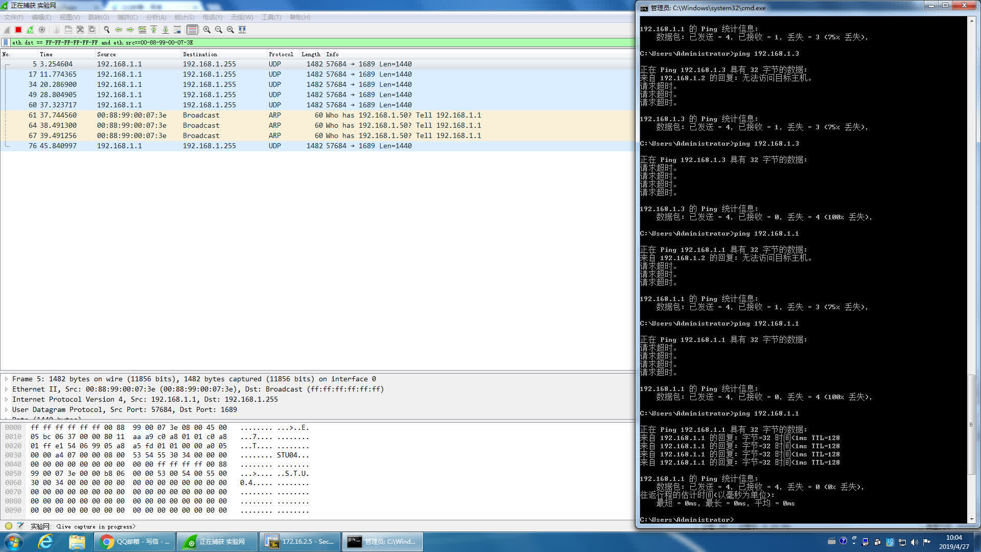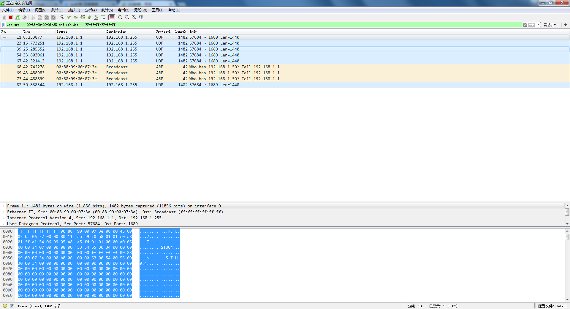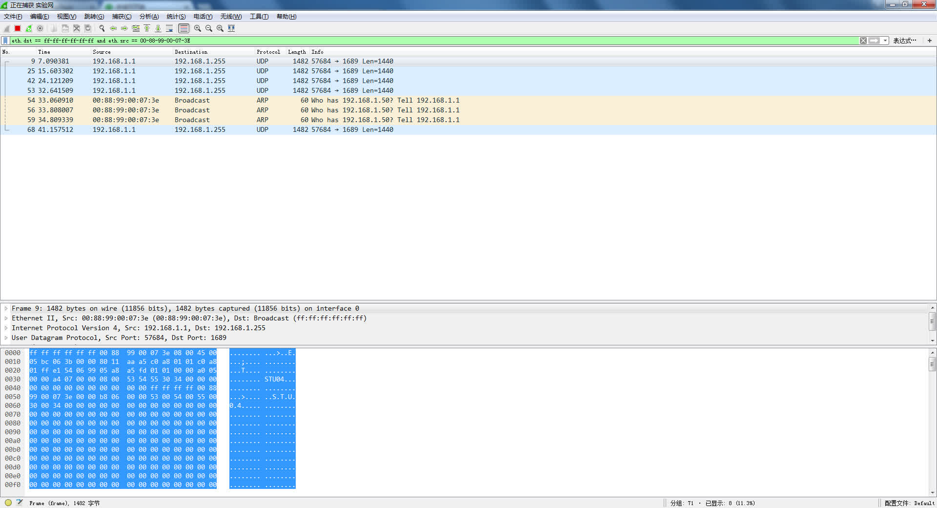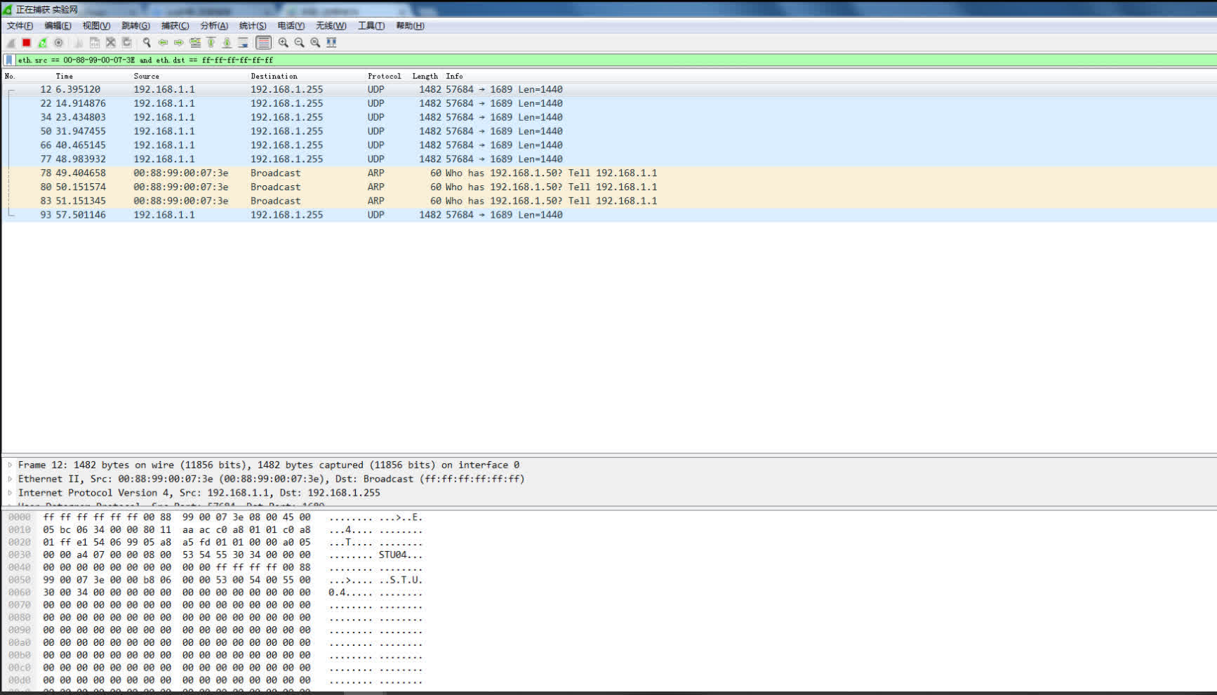 直接用anysend发送一个广播帧,或者用一台主机(例如,192.168.1.1)ping一个子网中不存在的IP地址(例如,192.168.1.50)来产生广播帧(ARP包)。在所有主机上用Wireshark检测这个以太网广播帧(源MAC地址为该主机的地址,目的MAC地址为广播地址)并截屏。