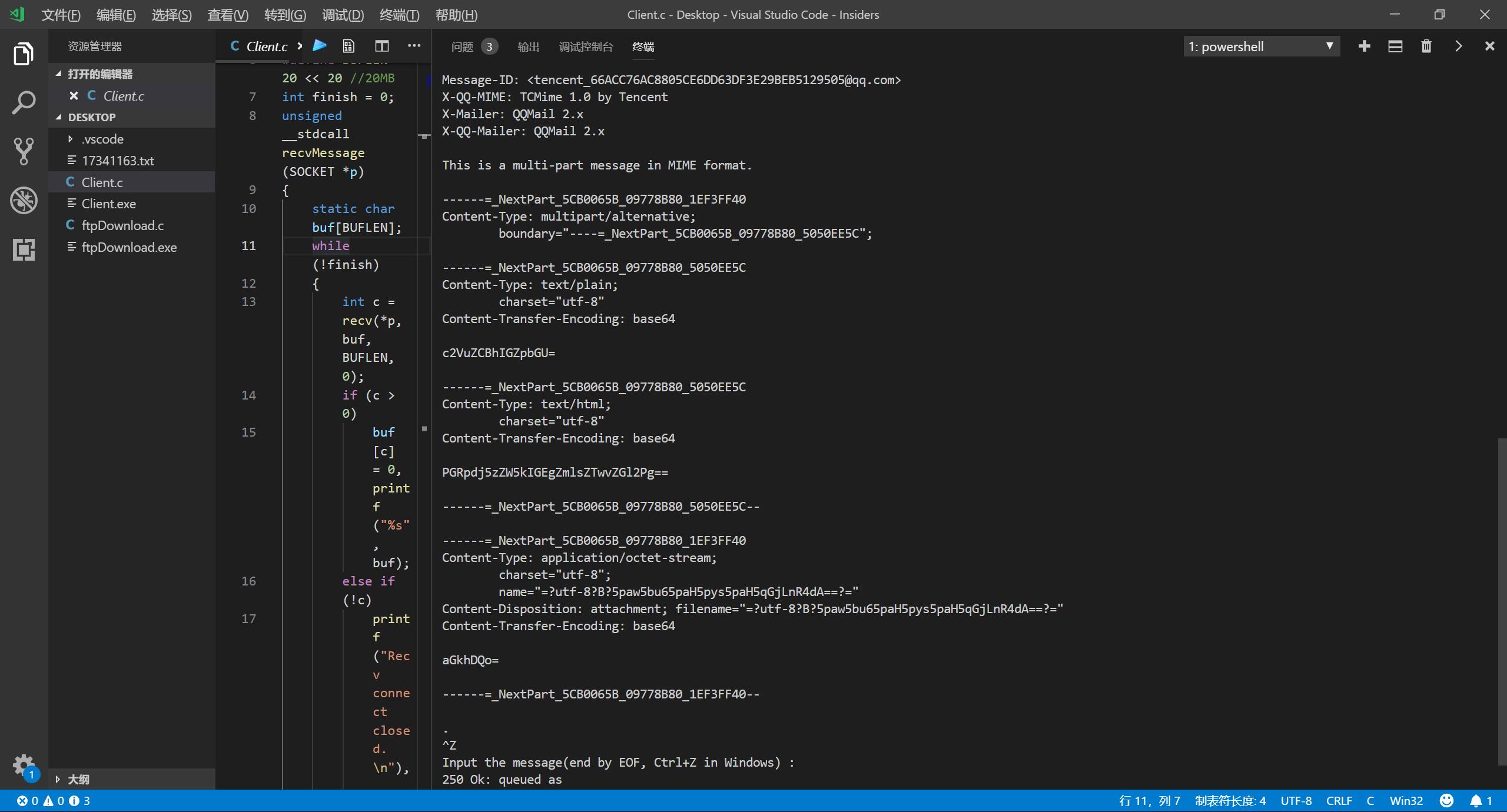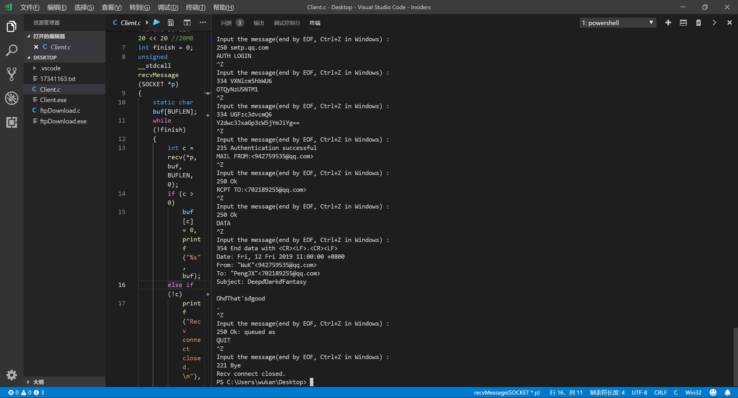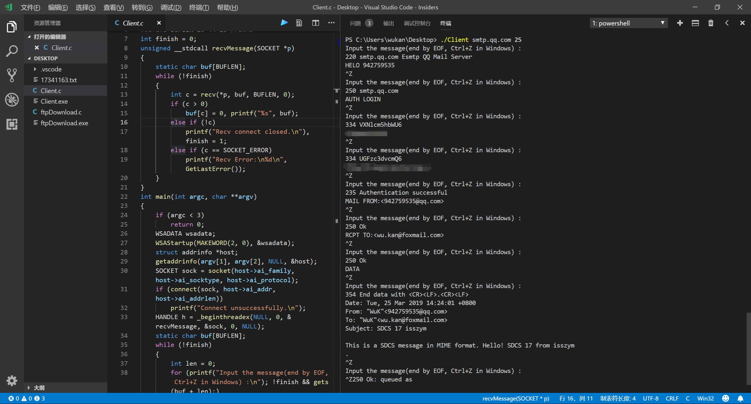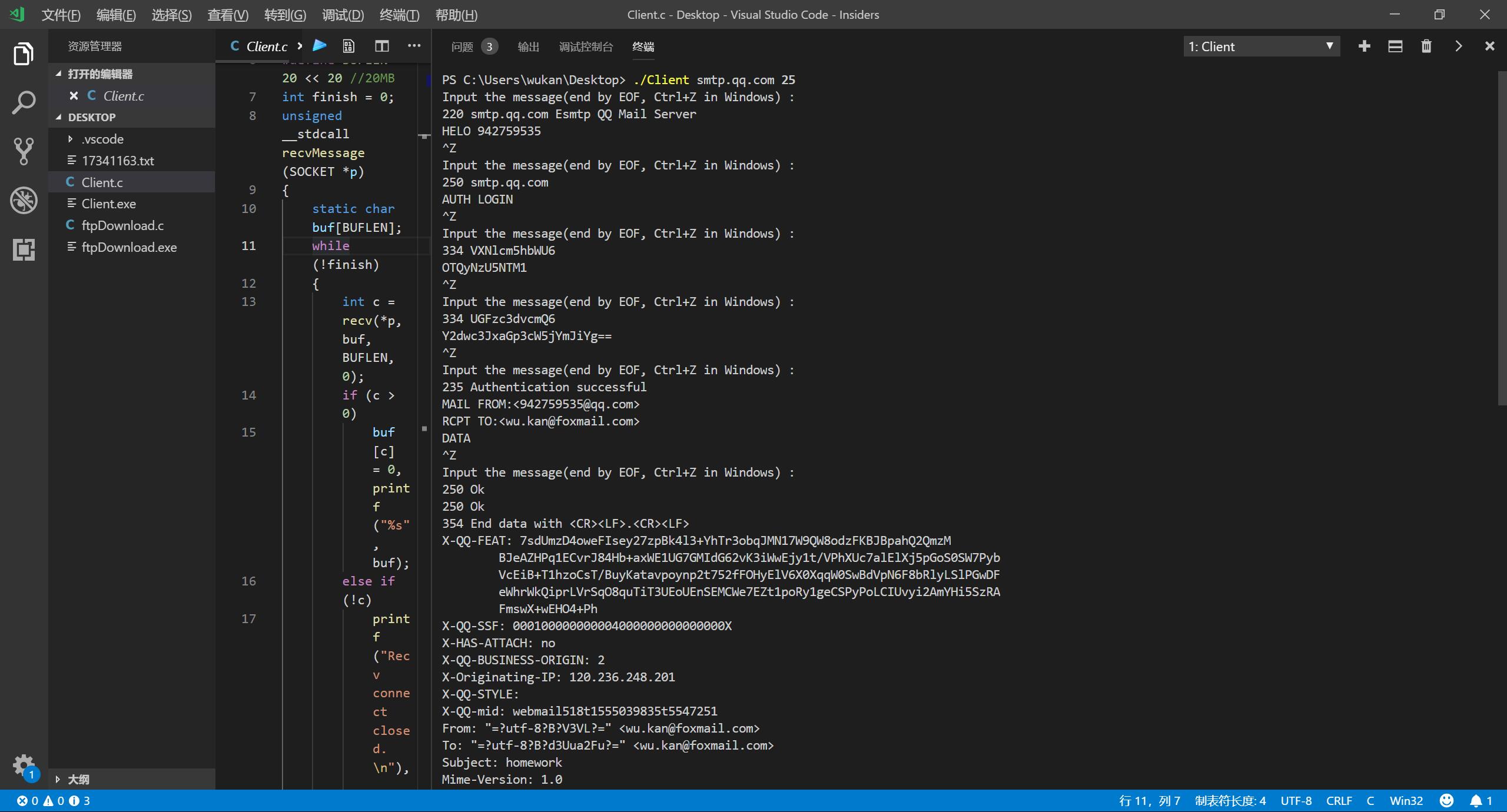 此外,由于使用了自己写的客户端,不支持SSL,因此需要连接的是QQ邮箱smtp.qq.com的25号端口了。