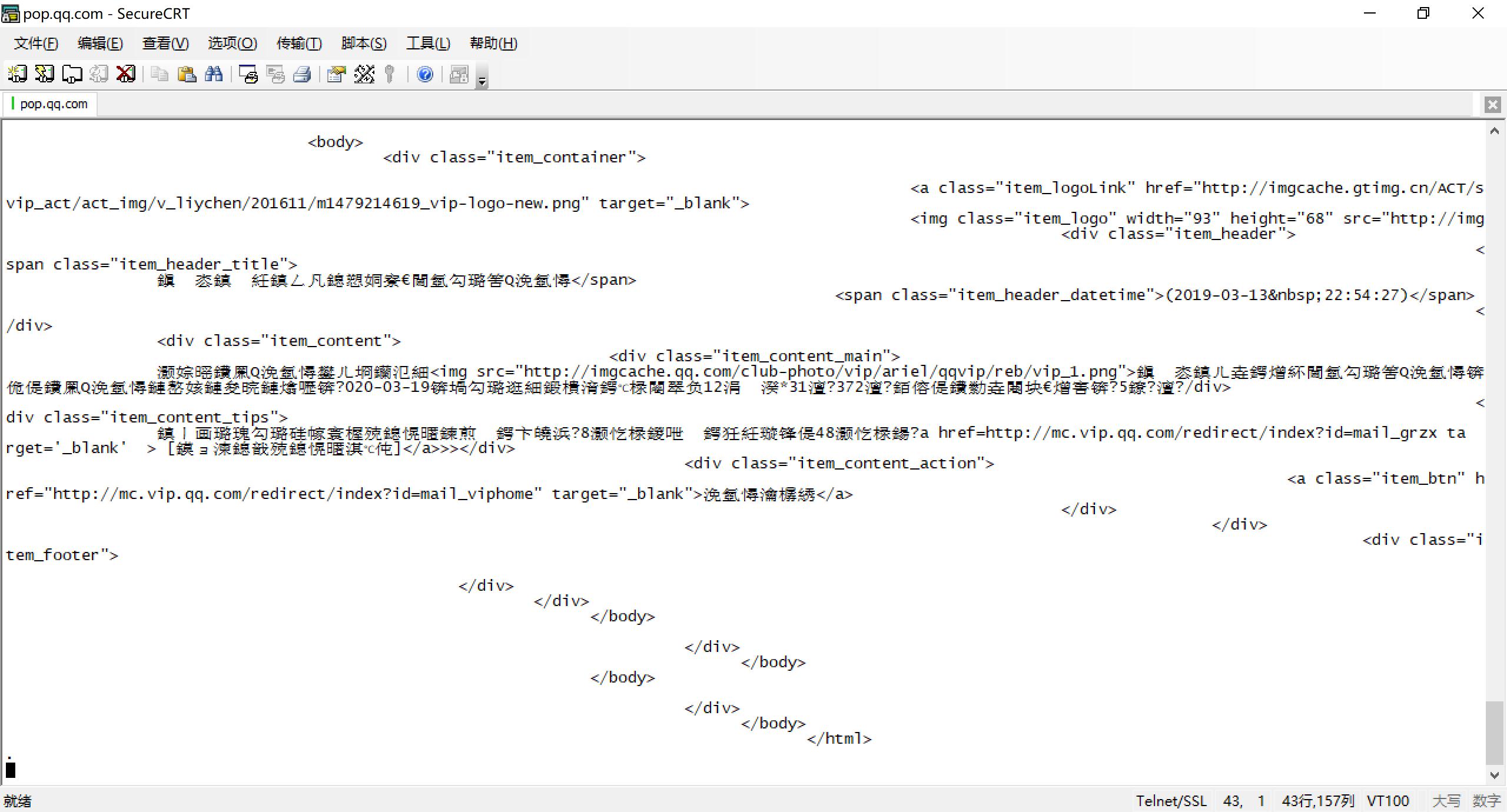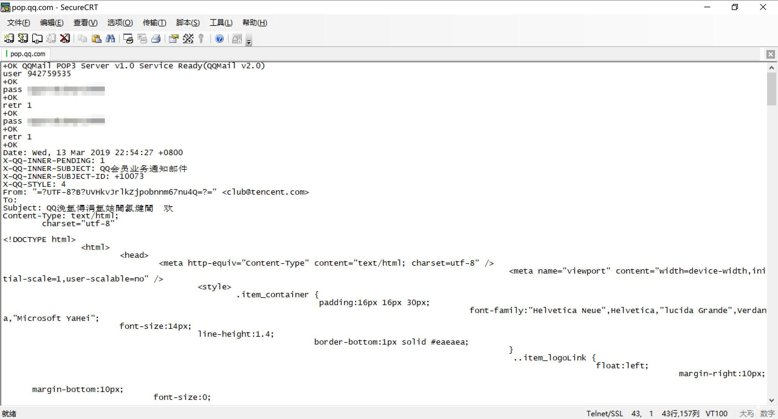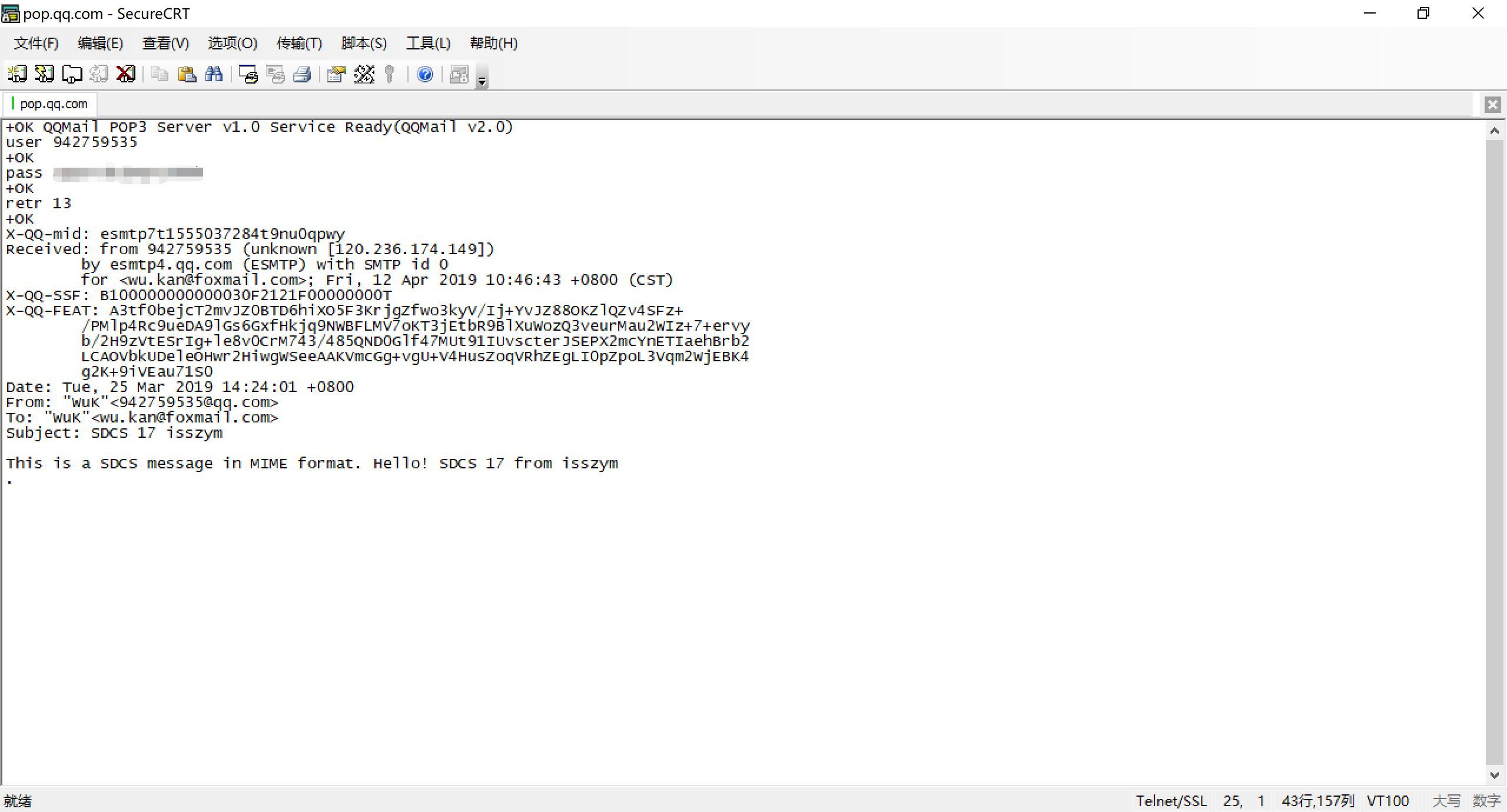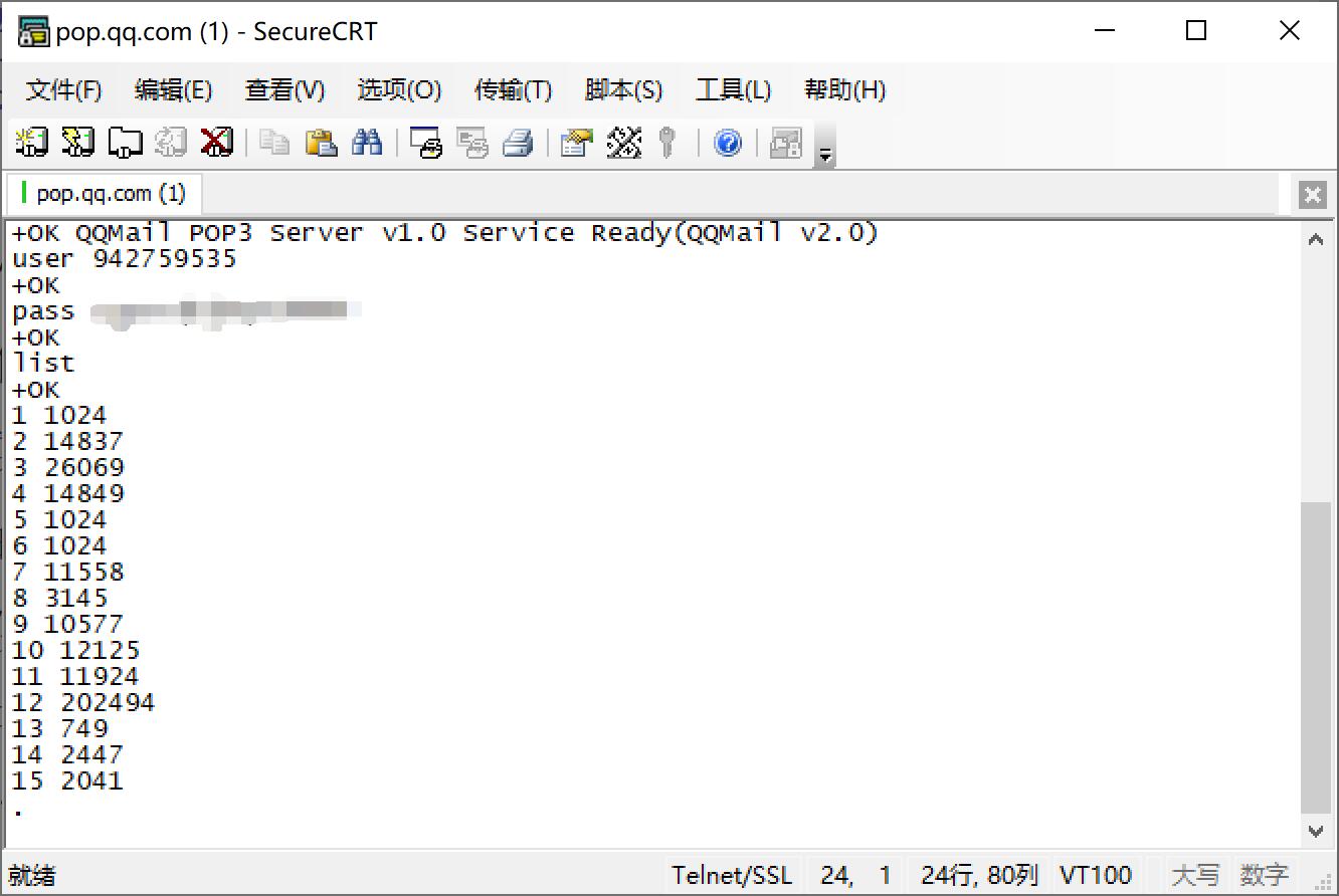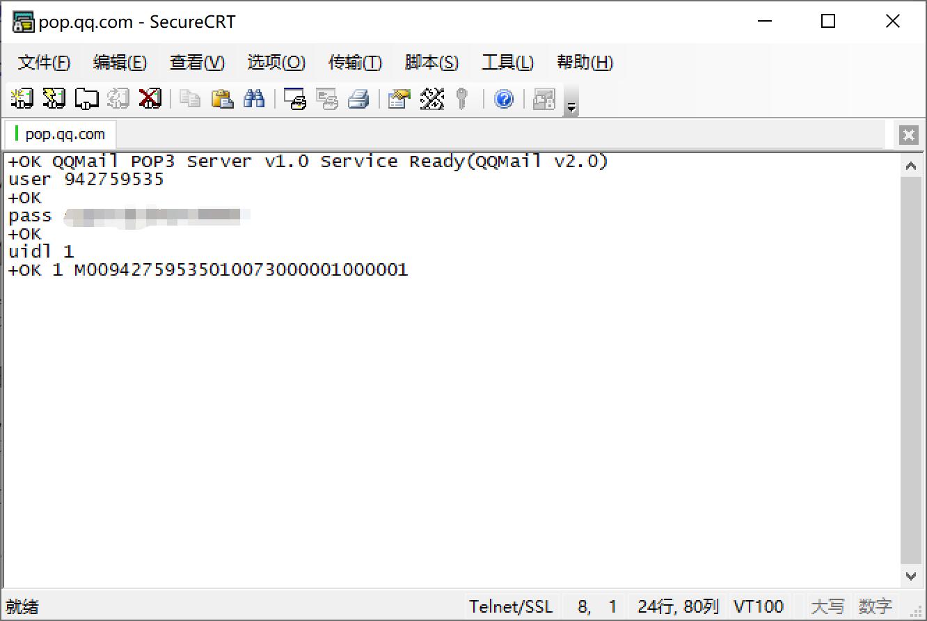 同上,这里使用了自己的QQ邮箱。尝试使用自己写的客户端,然而连接上服务器之后由于没有SSL被服务器拒绝了。因此这一部分使用SecureCRT完成。