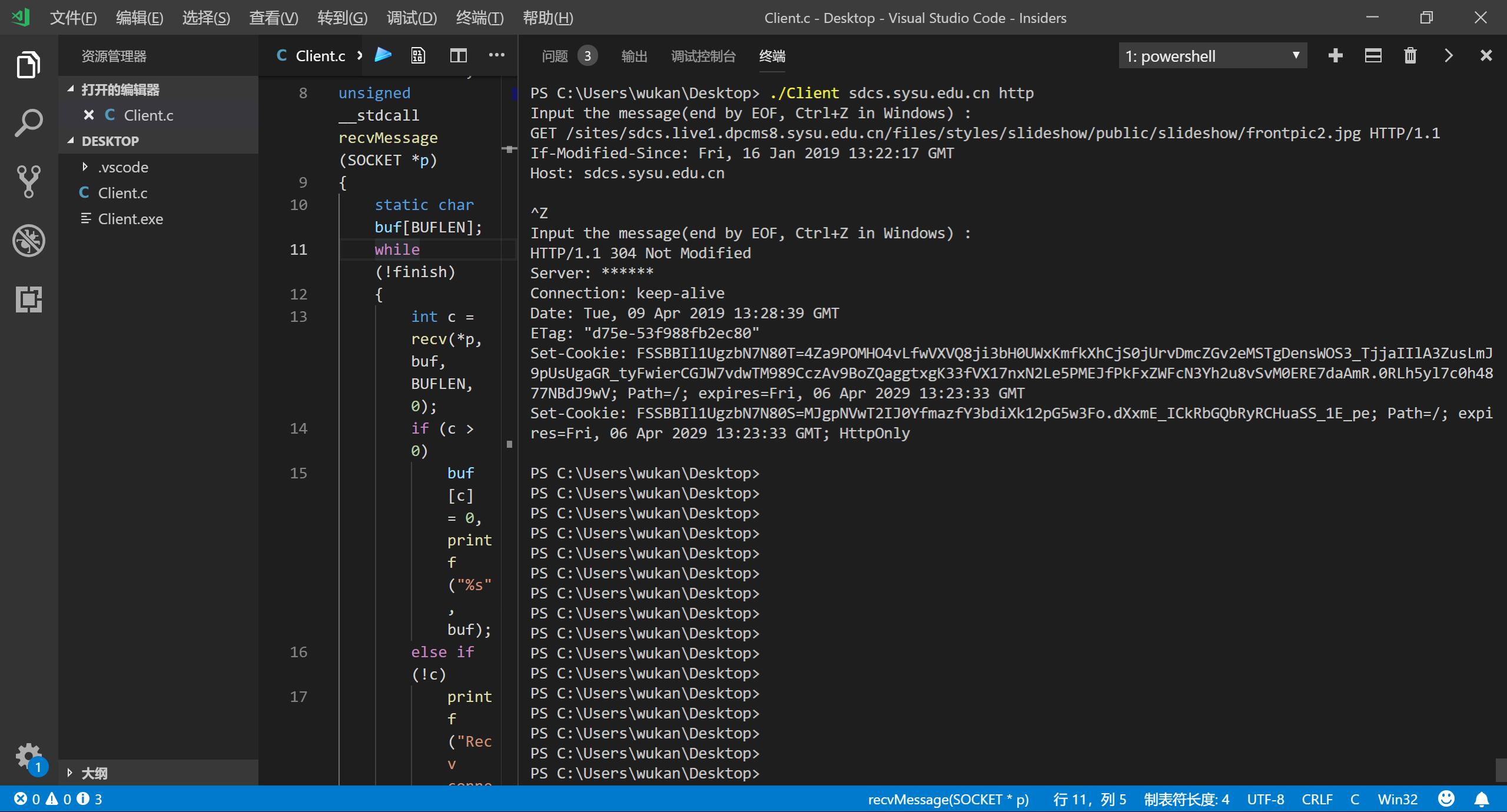 使用自己编写的TcpClient,采用聊天程序的客户端。该客户端采用两个进程实现:一个输入和发送线程,一个接收线程。(选做)如果不自己编写TcpClient,可以尝试使用老师给的TcpClient.exe完成步骤一~步骤四,如果不愿意尝试,可以使用telnet来完成实验。 源代码:
