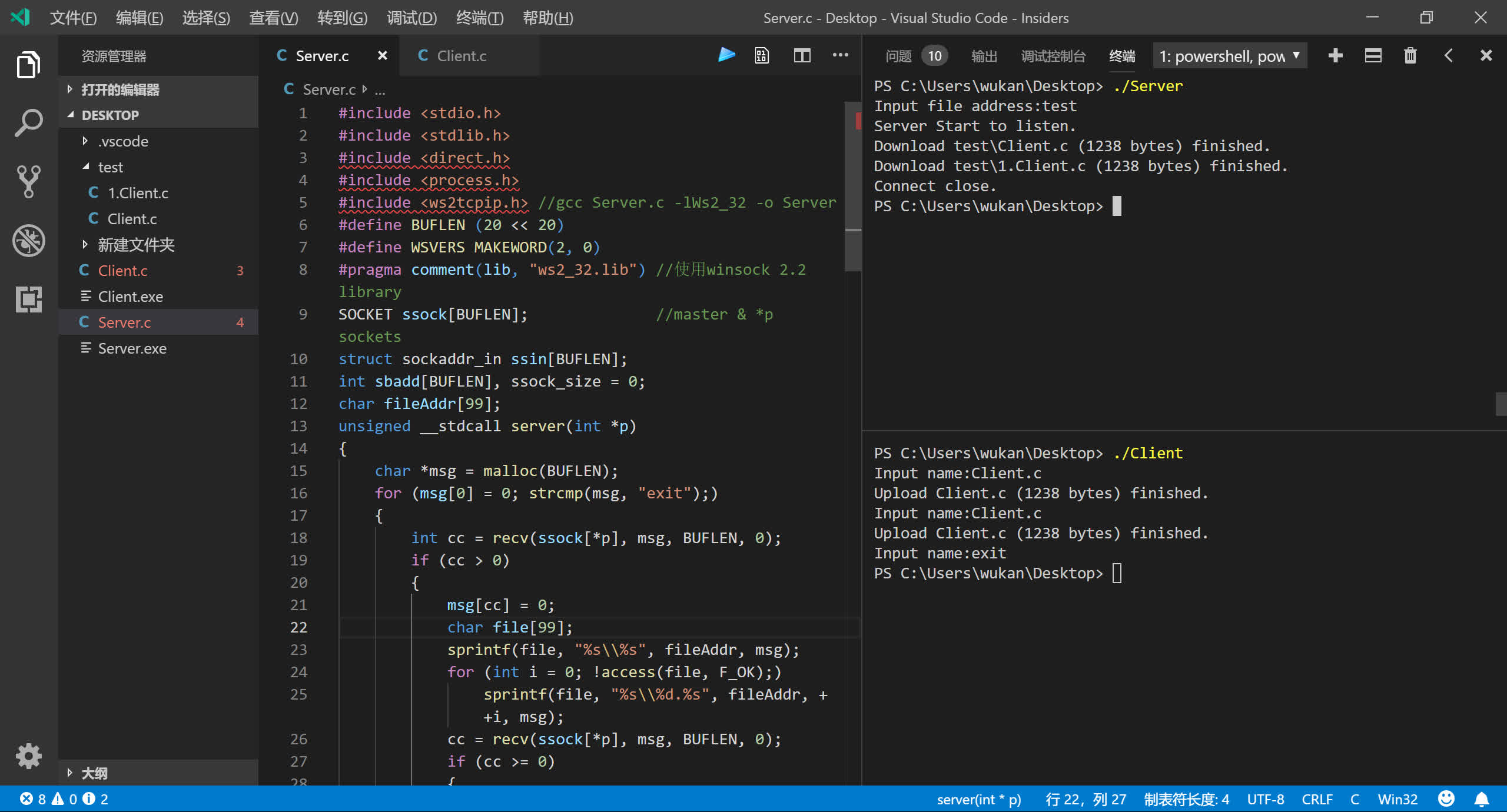 - 客户端先连接服务器,每次输入一个文件名(包含路径)就传输它,直到输入exit时退出并关闭套接字。