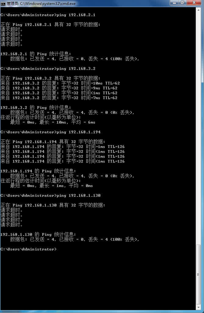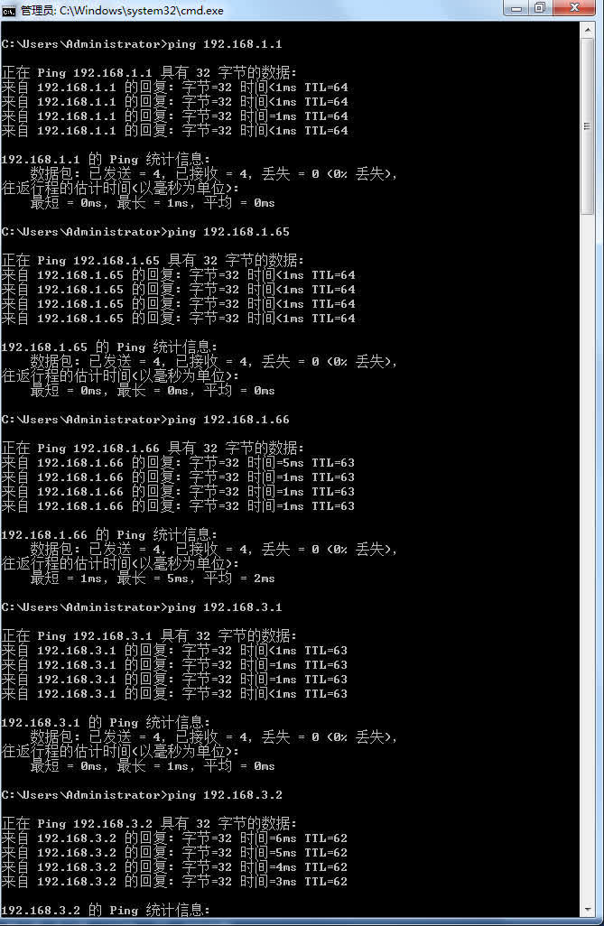 3B、PC1依次ping到PC3的路径上的IP地址后截屏