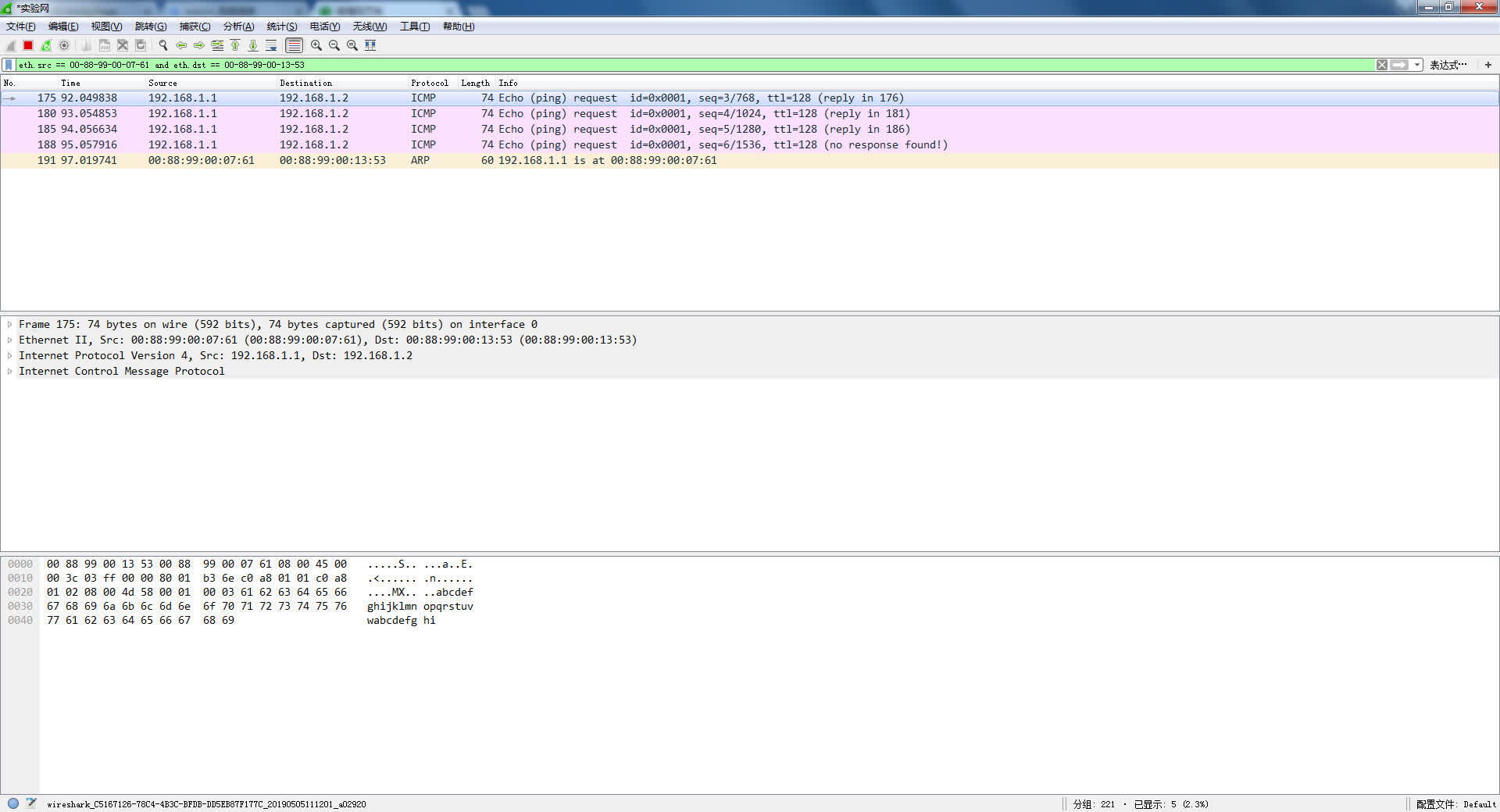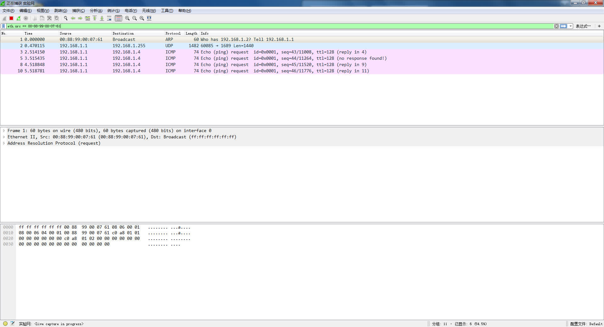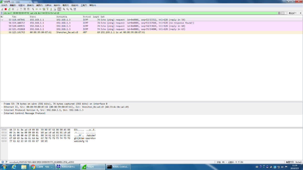 接收:用WireShark接收帧,选择实验网网卡,选择ARP协议,设置filter:eth.src==0001.0EC3.0F0E(改为源主机地址) 复杂filter:eth.src==0001.0EC3.0F0E or eth.dst==0002.DEF5.2D13
