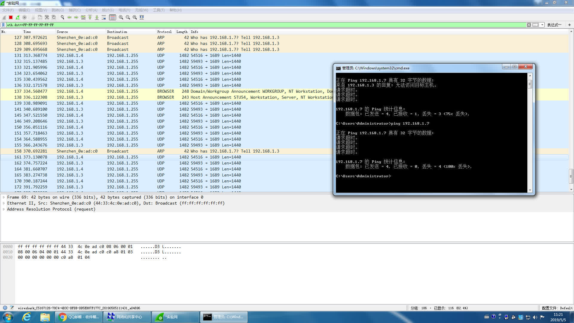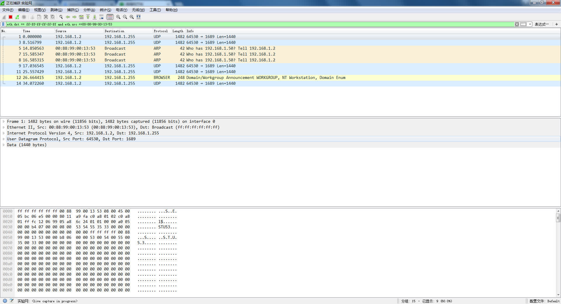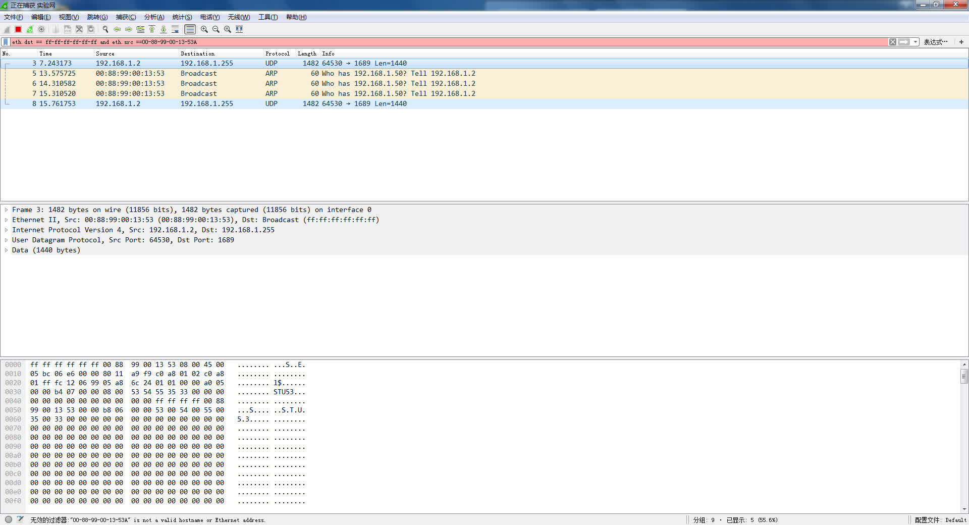 接收:用WireShark接收帧,选择实验网网卡,选择ARP协议,设置filter:eth.src==0001.0EC3.0F0E(改为源主机地址) 复杂filter:eth.src==0001.0EC3.0F0E or eth.dst==0002.DEF5.2D13