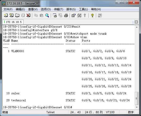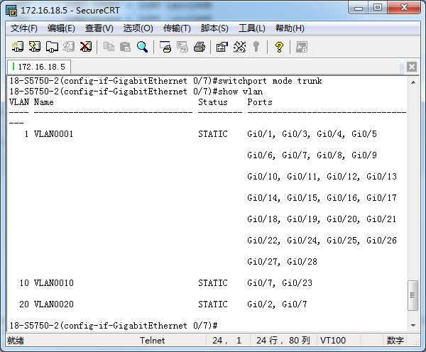 (config)#interface f0/24(config-if)#switchport mode trunk - 显示VLAN(不显示trunk接口)